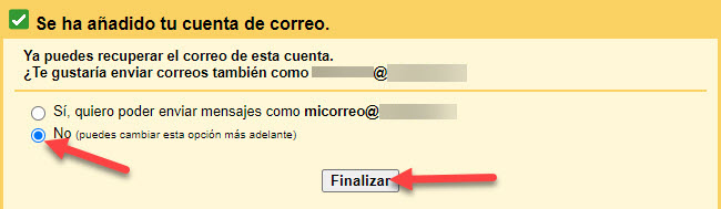 En este paso le recomendamos seleccionar No ya que usar cuentas externas para enviar mensajes a nombre de sus cuentas de correo de su dominio puede ocasionar que esos mensajes sean recibidos como spam por varios servidores de correo al no detectar que proceden de una de las direcciones IPs autorizadas.
